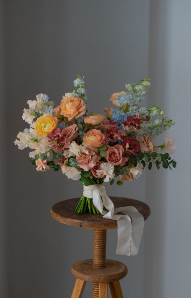 Obsessed with the different pastel colors making this bouquet look like it’s straight from the countryside. Beautiful arrangement and a perfect end with the ribbon holding it together.
