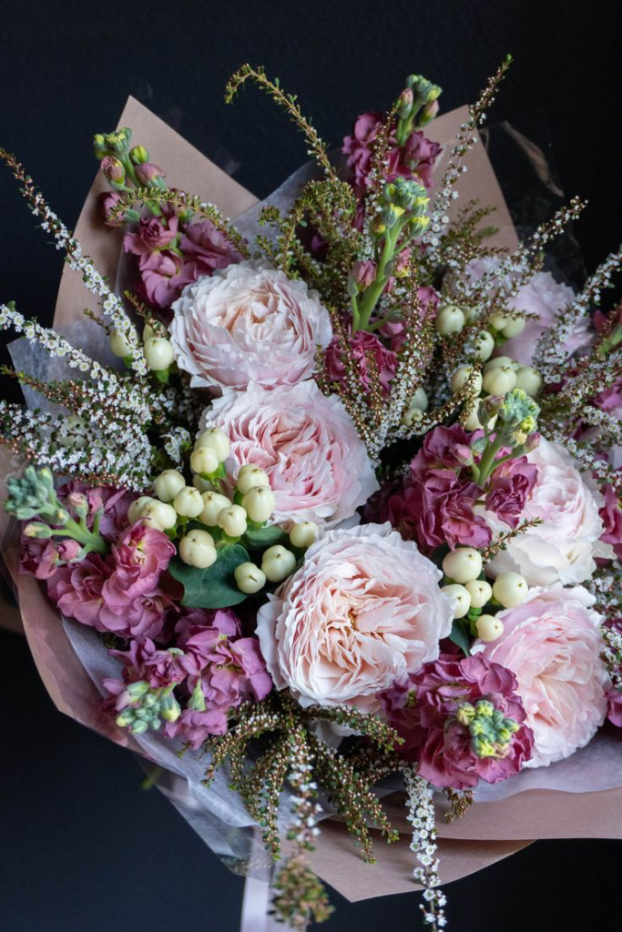 Another easy way to elevate your bouquet is to work with unique flower colors. These vintage roses have a gorgeous color, all while being the ultimate classic for Valentine’s Day. By working with a few gentle contrasting flowers that stick out of the bouquet you are creating height and something extremely special. What a gorgeous creation without needing lots of different flowers!