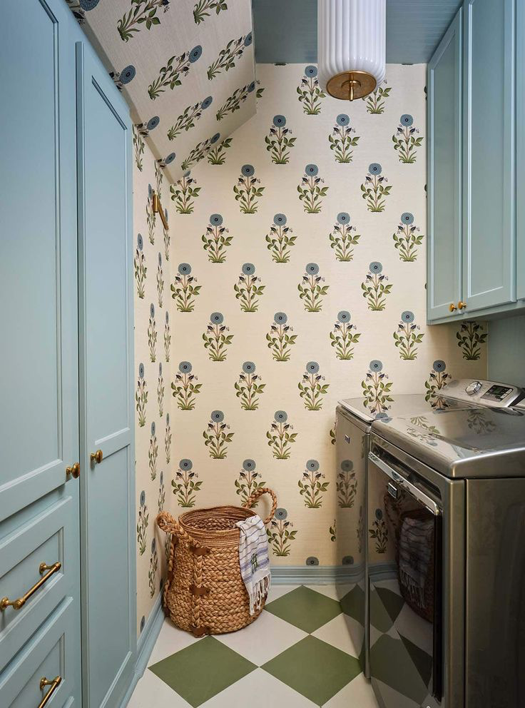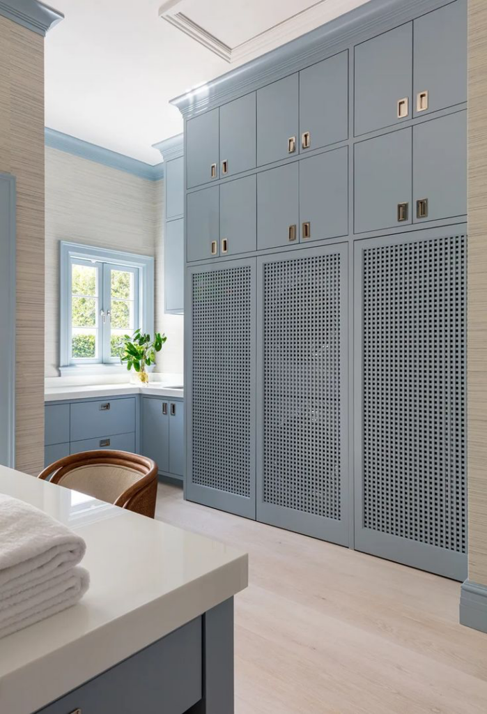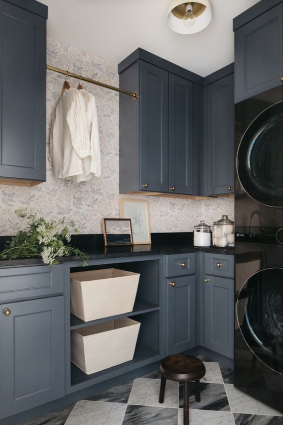 Design a laundry room with fun colors and wallpaper, and you’ll miraculously love doing laundry! This inspo is gorgeous, particularly with very unique washing machine and tumble dryer designs. The wallpaper is making the room extra special and unique, matching the cupboards.