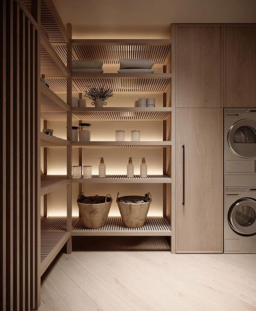 Another stylish way to bring your laundry room to life is by working with the Japandi style. Japandi defines itself through natural, sleek elements with soft wood and textured materials, achieving a minimal but warm look. This laundry room, combined with a large space, nice lighting, and a combination of open and closed storage is a perfect way to make the laundry room a comfortable space.