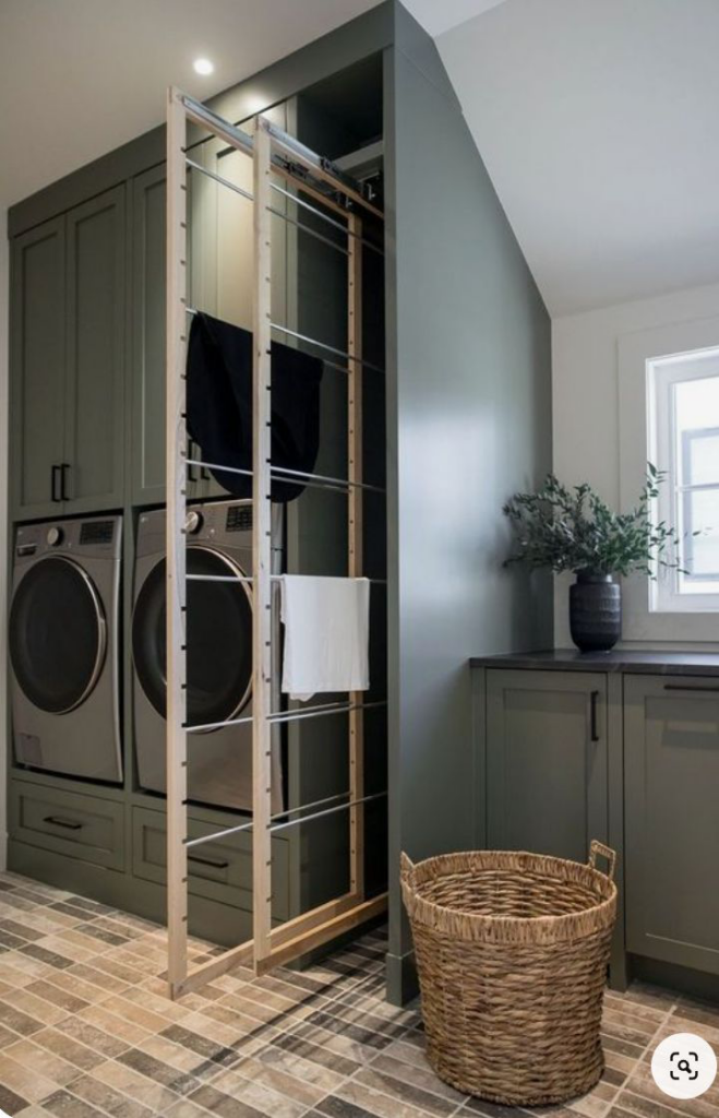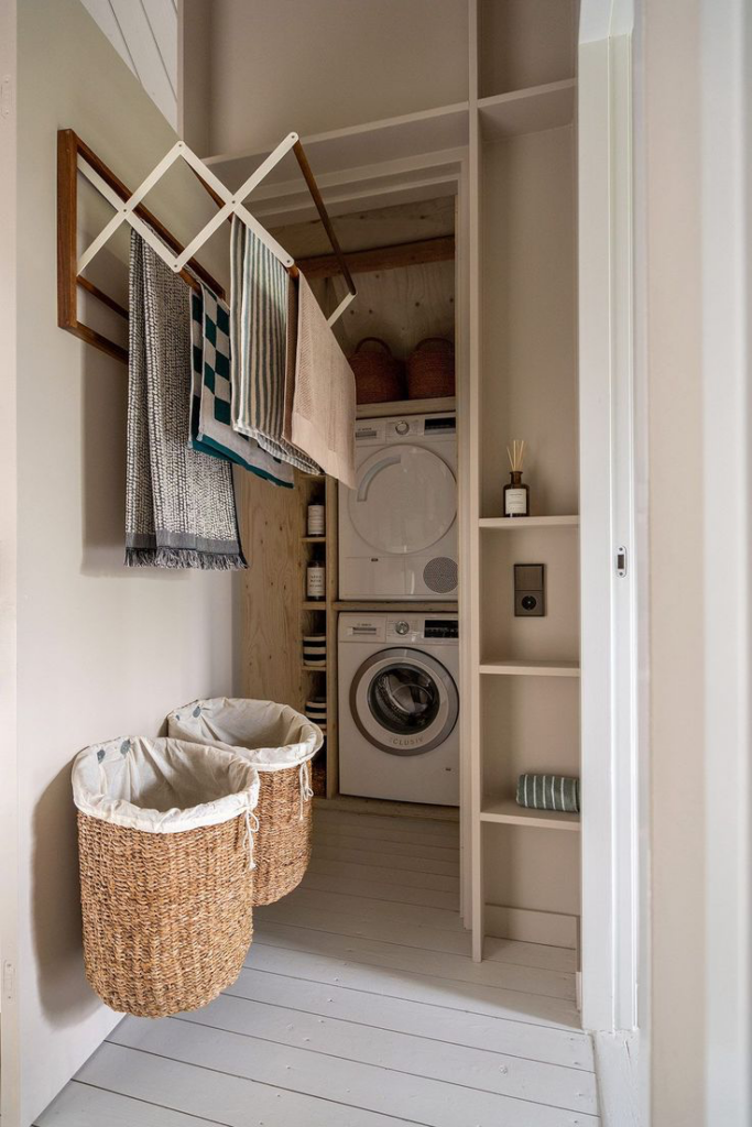 I love this space, as it really makes use of all of it! A very slim and narrow space with quite a high ceiling was used to perfection, with a foldable clothing rack and laundry baskets, while the washing machine and tumble dryer are stacked on top of each other. This is a great design if you have an apartment and don’t know where to store your laundry.