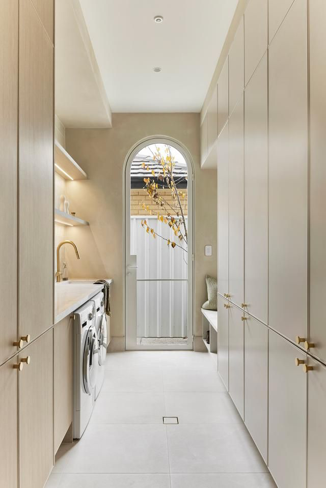 A large laundry room with lots of storage and a lovely window/door to bring in light. Slim rooms can often be used perfectly as laundry rooms, as you are not spending a substantial amount of time in it. When organized directly, it can be the perfect place, such as in this example. I particularly love the neutral colors complementing the bright light, making the space very happy and bright.