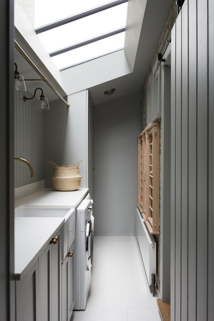 This laundry room is a perfect example of how a tiny, dark room can be transformed into something special. Due to the roof window, the room receives lots of natural light all while still being small and packed, but nicely organized. No better place to store away your laundry!