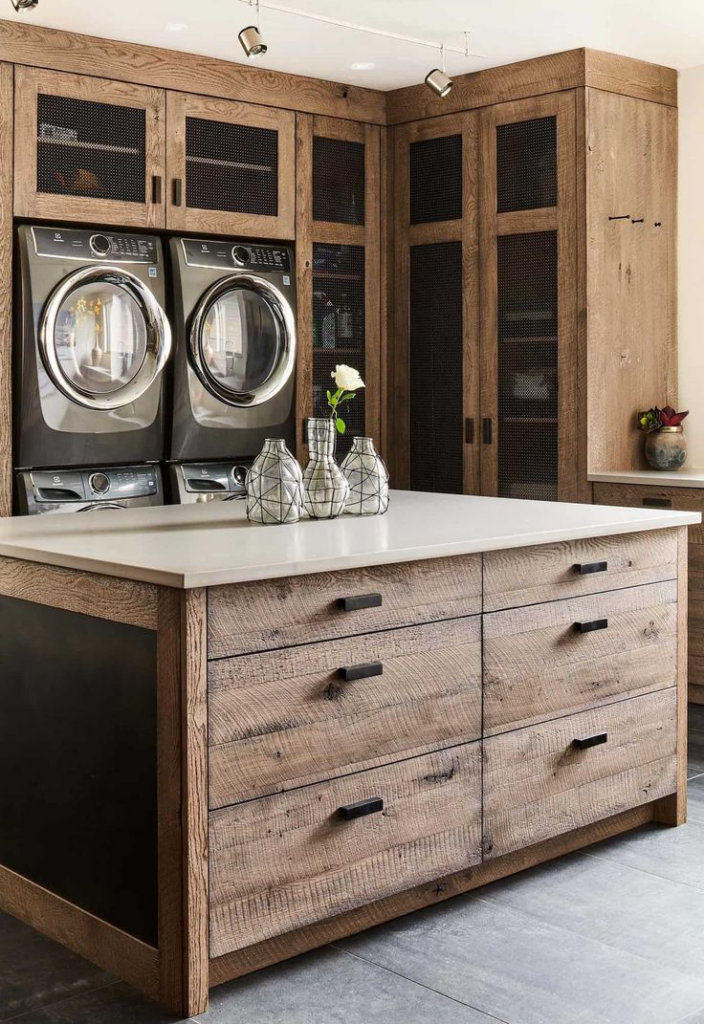 Okay, what a stunning design is this! This chalet inspired laundry room works with lots of natural materials such as structured and textured wood, as well as storage with glass elements. What a perfect design, particularly great for homes located in the mountains or in holiday regions.