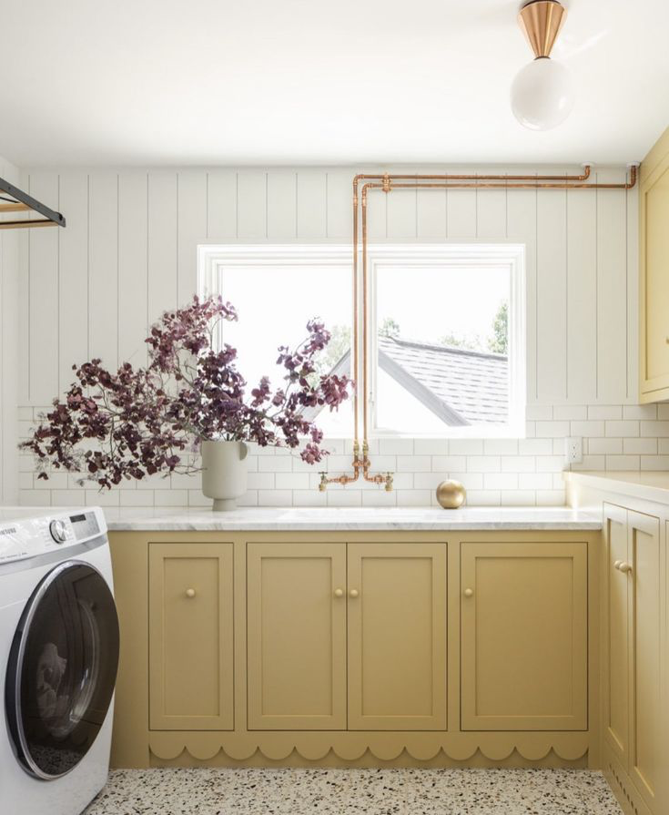 How could I not share this stunning design as inspo? I absolutely love what this room was turned into. It doesn’t have what you would call the perfect specifications, as it has low ceilings, a quite boring window, etc., but it was turned into a special space by paying attention to details. In this case, the cupboards were painted in a happy yellow, as well as there was a nice trim added at the bottom, bringing in something fun and a unique shape. Furthermore, the appliances and faucet of the sink is gorgeous with the visible pipes!