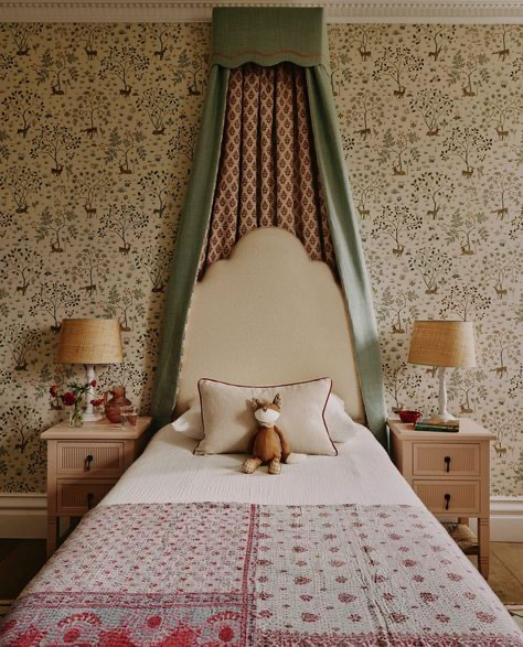 I told you I love wallpaper, and this is a great example of how this kid’s room was turned into a stunning and inspiring space. Paired with a little tent and some nice, patterned fabrics, this room is really tied together.