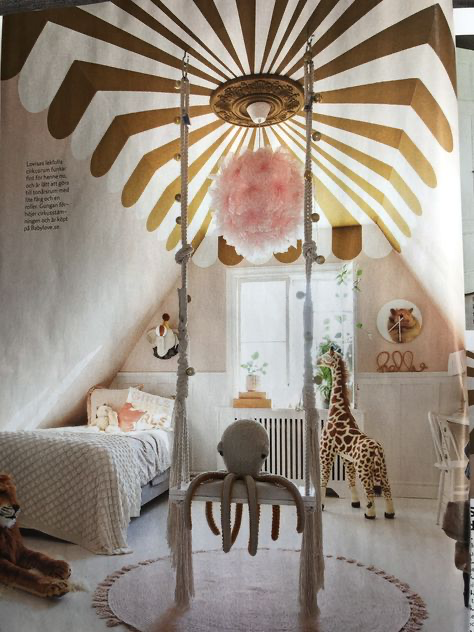 This room is absolutely stunning and has included so many amazing items. The first ting that really shows is the stunningly painted ceiling, which is actually an attic space. Making the most of the shape and height, the ceiling was painted in what looks like a circus tent, a current trend. However, that’s not all! A swing in the room makes it even more special. With these elements included, there doesn’t need to be much else going on, as we can see, the walls are kept in a gentle color only. Perfect place any kid would love!