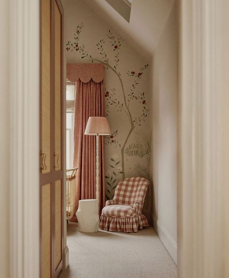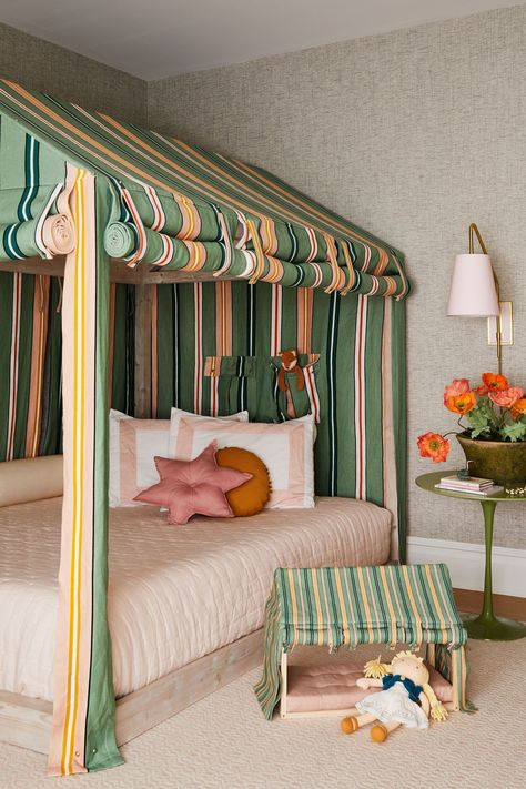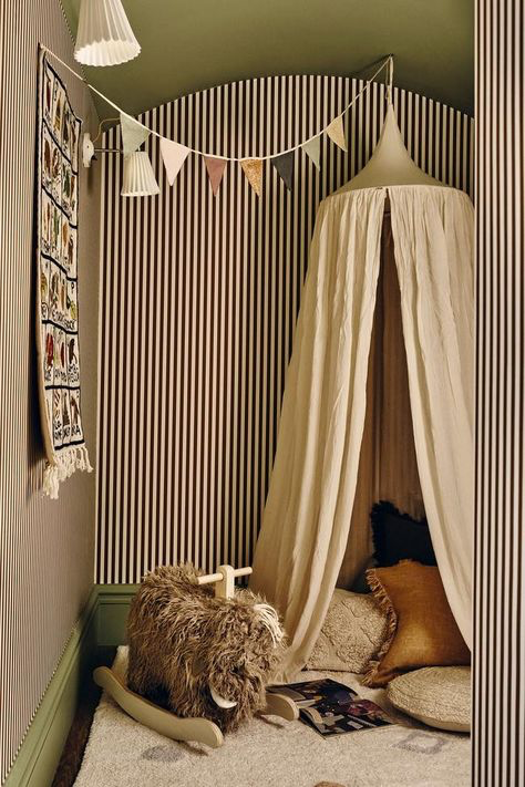 Beautiful use of color, pattern, and shapes. I love that the curved ceiling is painted, and the walls have the striped wallpaper, bringing in something unique and special. The little tent with the pillows just makes you want to lie down, while the greenly painted floor skirtings, matching the ceiling ground the full space.