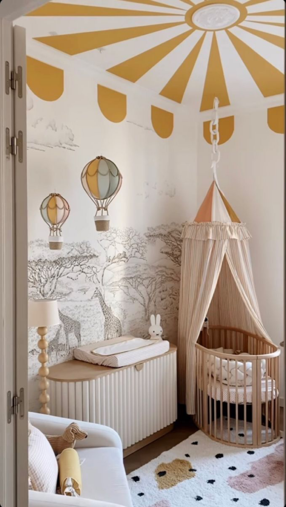 Another great example where the ceiling has been used as a circus tent, while hot air balloons in matching colors, and a gorgeous wallpaper bring in so much movement and excitingness. Even though there hasn’t been too much color used, the space just looks absolutely cute! The little bed with the tent hanging over it is just the absolute cherry on the top!