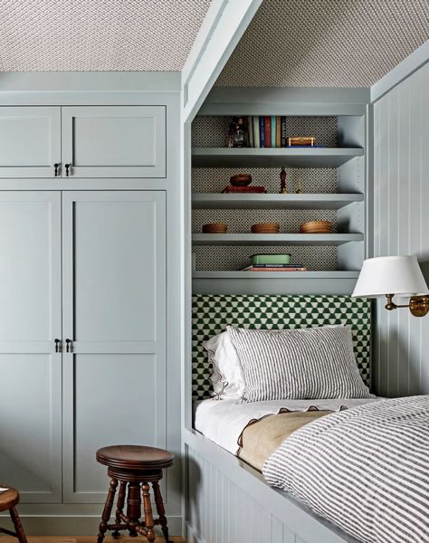 Can you identify what makes this room so satisfying looking at it? Well, the wallpaper which has a contrasting ground color however matches with the contrasting blue/purple color used on the floor skirtings, the ceiling, and window frames, which ties the space together and brings a sense of calmness into the otherwise fancy wallpaper. Additionally, darker tones on the furniture and a structured open shelf makes the space calm yet exciting. A great example for a kids room!