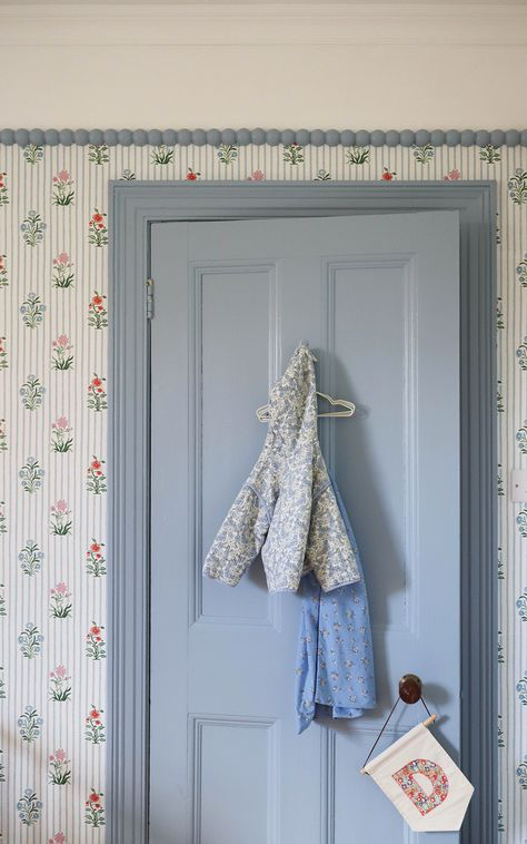Ok, this might be one of my all time faves! How perfect is the baby-blue door and door frame paired with the bubble-trim above? And how perfect does this super cute floral wallpaper match and blend in? Love this very creative approach!