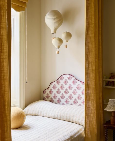 Love this room design, as it is suitable for kids but also for teenagers. The headboard is adding so much depth and character, while the curtains matching the blinds just make the space perfectly tied together. The floating hot hair balloons blending in with the wall color just add that unique touch.