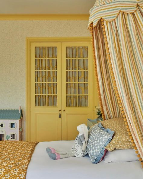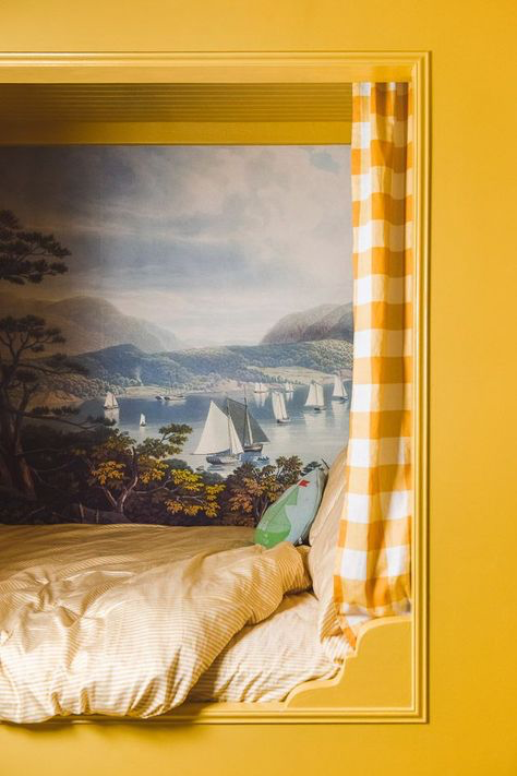 I love this! The yellow, the cave-like bed, the curtain, and then the stunning wallpaper making the bed look like it’s located at a window. Beautiful to dream where life will take you!