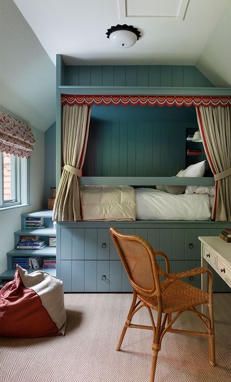 This stunning kids room even spreads across to levels, with a cute staircase leading up to another part. A mix of gentle and stronger colors tie the space together, playing with stronger contrasts in the textiles such as blue, yellow, and red. The calming wall colors, however, bring in a sense of calmness, while the glimpse of blue wallpaper in the second floor is inviting and interesting. Note: perfect addition in this space is the runner on the stairs AND the fantastic roof windows. These items change everything! Another thing I really love is how well the colors were coordinated. By using red as the trim of the runner and in the wall shelf, it really coordinates well and ties the room together, without being too much of a contrast.