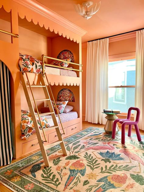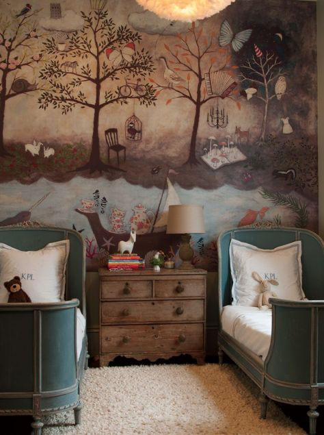 This shared kid’s room literally looks like it’s straight from a move. So much going on, on the gorgeous wallpaper, with animals, dreamy spaces, and beautiful colors. It really screams the sky is not the limit!