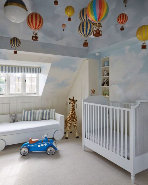 Wow, now that’s a gorgeous room! However, this is actually quite easy. The cloud wallpaper added to the ceiling and walls makes it look like you’re sleeping under the sky, and all the floating hot air balloons bring in color and depth. I absolutely love this simple design, kept mostly in neutral ground colors.