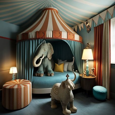 Now that’s a literal circus at home! The bed is under a literal circus tent, and the ceiling is painted to even enhance that. Look how it has the effect as if it goes up even higher? Great artistic eye there! Large stuffed animals make the room feel even more like it’s a life-like circus, and even the curtains and furniture is all chosen to match the circus vibe. I love this! You can really see the thought behind it and going all-in. Very brave that definitely pays off!