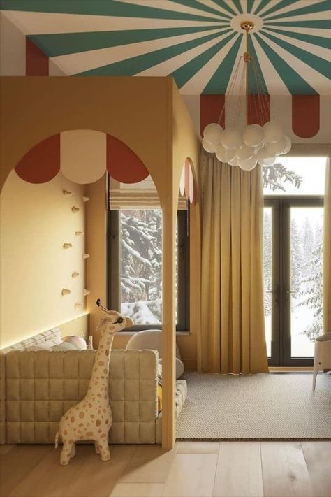 Another cute example of using a circus tent on the ceiling. While this one is in accent colors, the rest is kept quite in one color: yellow. I love that the red has been brought in to add a third color (if you know, you know: the rule of thirds), making this space really stunning.