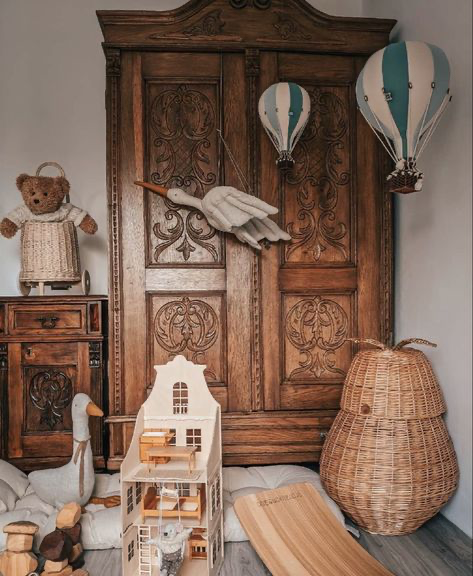 As a contrast to the previous example, this stunning kids room combines vintage elements such as this stunning wardrobe and sideboard with cute toys. Overall kept in a more neutral color scheme, this is just as a nice space as the above, just totally different!