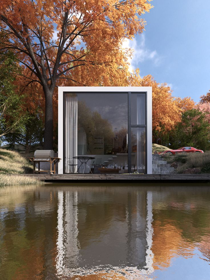 Exciting architecture drives this stunning tiny house with large windows and effective space planning. Perfect to relax.