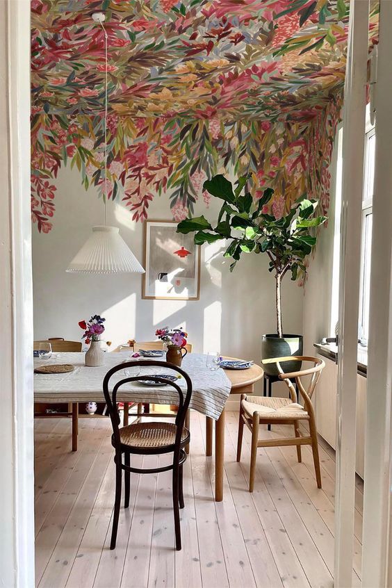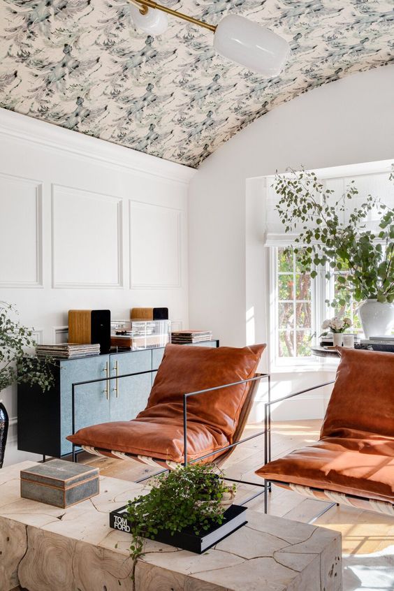 Graphic wallpaper is another popular choice for adding interest to ceilings. From geometric patterns to floral motifs, the possibilities are endless. Wallpapering the ceiling can draw the eye upward, creating the illusion of height and adding a touch of whimsy to any room. This approach is particularly effective in spaces where traditional designs may feel too predictable. Personally, I also love to include wallpaper in bedroom ceiling design (fantastic for children’s rooms!) as it makes the room very special and can add a dreamy feeling, as well as bedrooms are also often rooms that are not used the whole day, making it the perfect place to add a bit of spice.