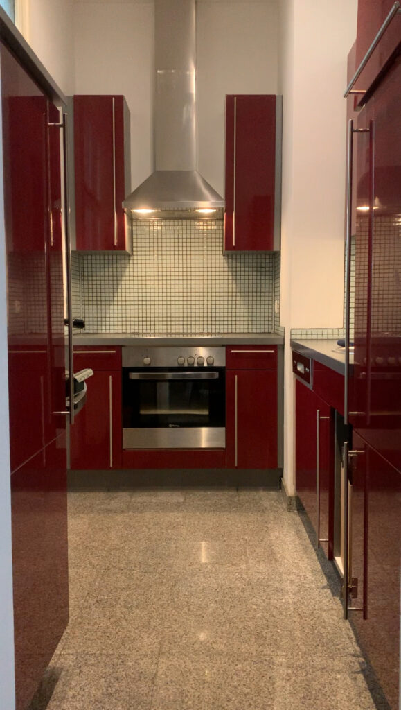 The original kitchen in my apartment had red glossy cabinets with mint mosaic tiles and was very poorly put together. The electrical devices were cheap and nearly all of them didn’t function properly. Furthermore, the worktop was broken (ripped open which was super unhygienic as you couldn’t clean properly), as well as the cupboards were sometimes difficult to open, as the cupboards were not straight. First, we decided to foil the kitchen in a grey color. However, we always knew that this would be a temporary solution, as the kitchen was in such a bad shape that we simply needed a new one in the near future.