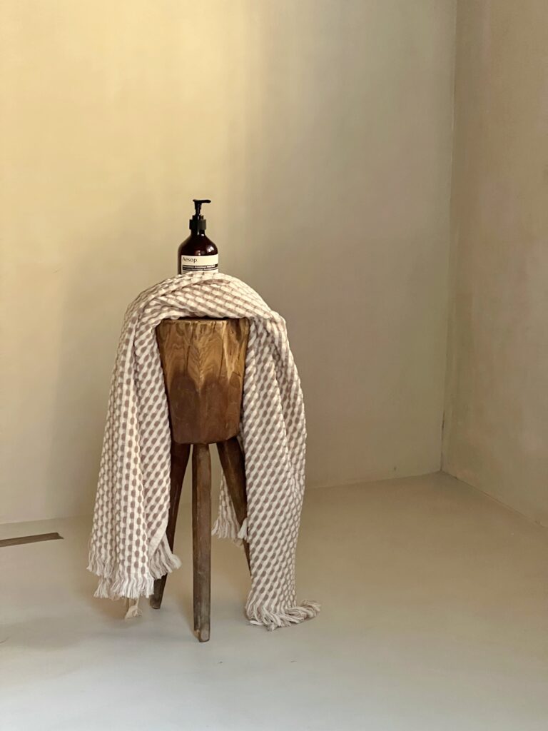 Another challenge was the toilet. On one hand, I wanted a modern toilet which wouldn’t stand out too much. Therefore, I ended up adding a vintage flush plate by Devon&Devon made of 24k gold, as well as blinds with a wavey rim which were custom made for this room. Some details such as an antique wooden stool, nice towels and brass hardware from Mi & Gei made sure the finishing touches were the perfect addition to this bathroom.