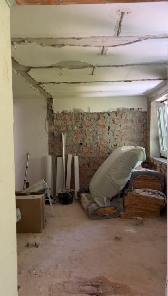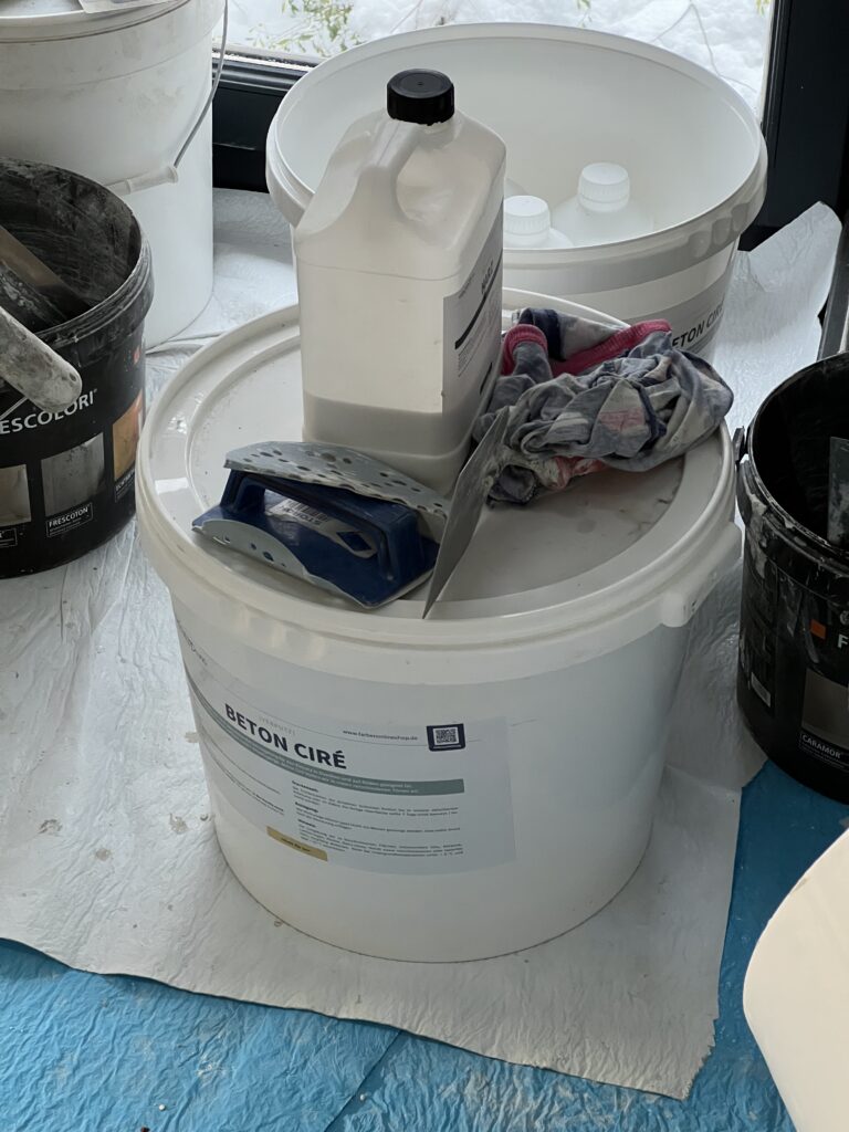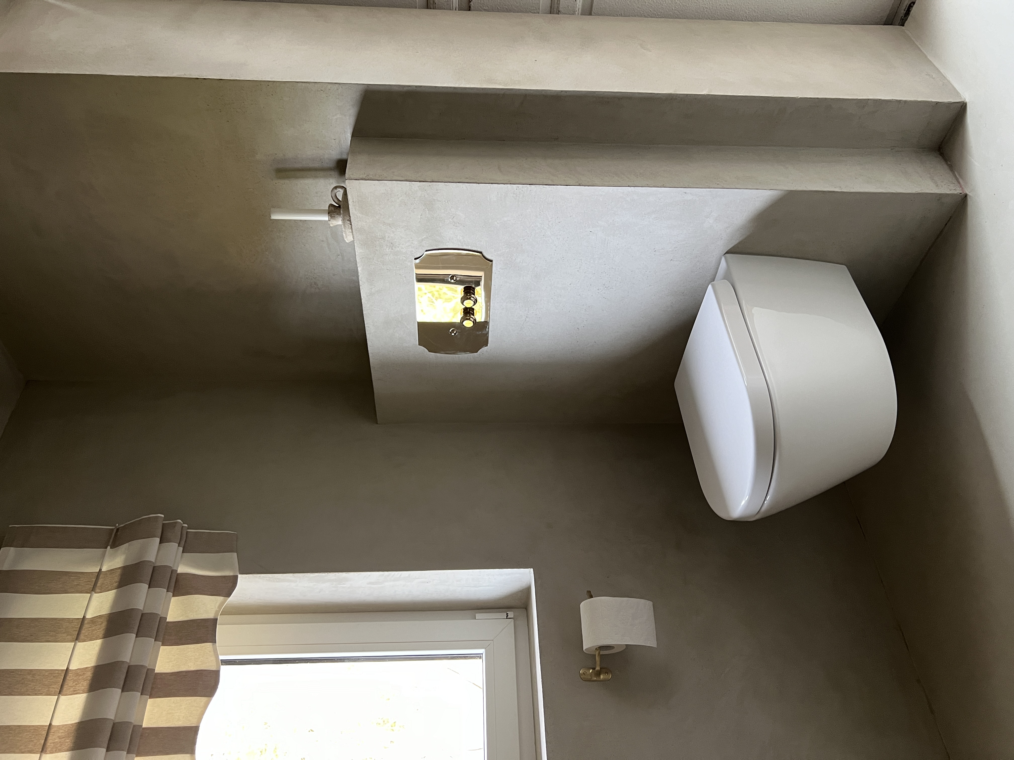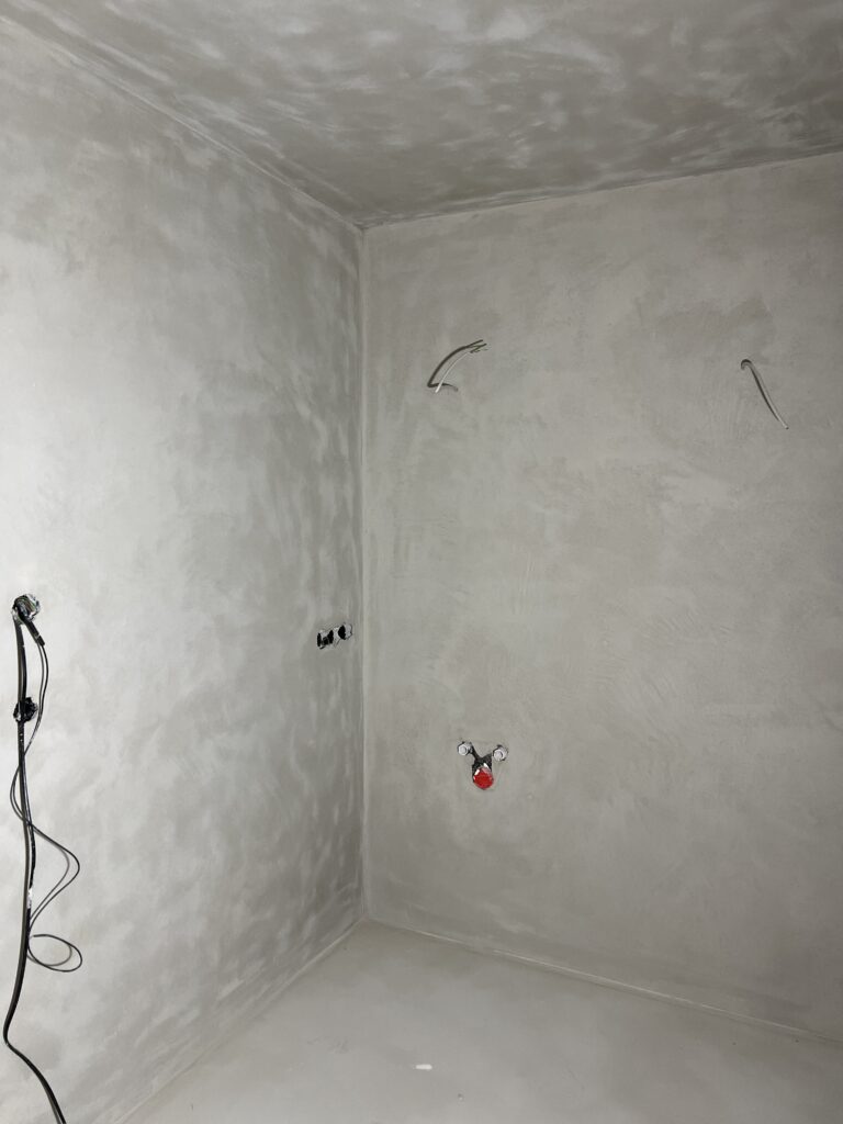 In order to do that, I decided to work with beton ciré and mineral plaster from VerWANDlung so the bathroom would be jointless. Beton Ciré is waterproof, mineral plaster looks very similar but is breathable and natural. The combination of these two products is perfect for any spaces! The jointless look where everything (floor, walls, ceiling) are covered with the same material also has the effect that the room looks much bigger and higher. Additionally, it has a lovely texture too. So this is what we did …