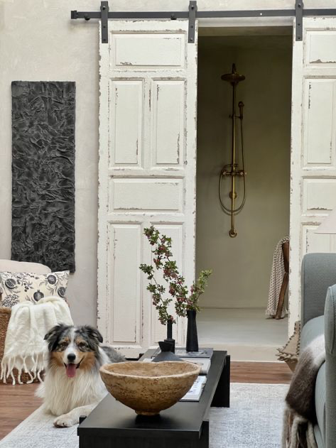 The neutral color palette chosen in Project Greenwood was perfect to combine new, modern elements such as the painting and textiles with vintage elements such as the barn doors, bowl, and antique shower. It is very easy to incorporate such things when working with neutrals as a base, as many vintage items have natural colors and materials anyways.