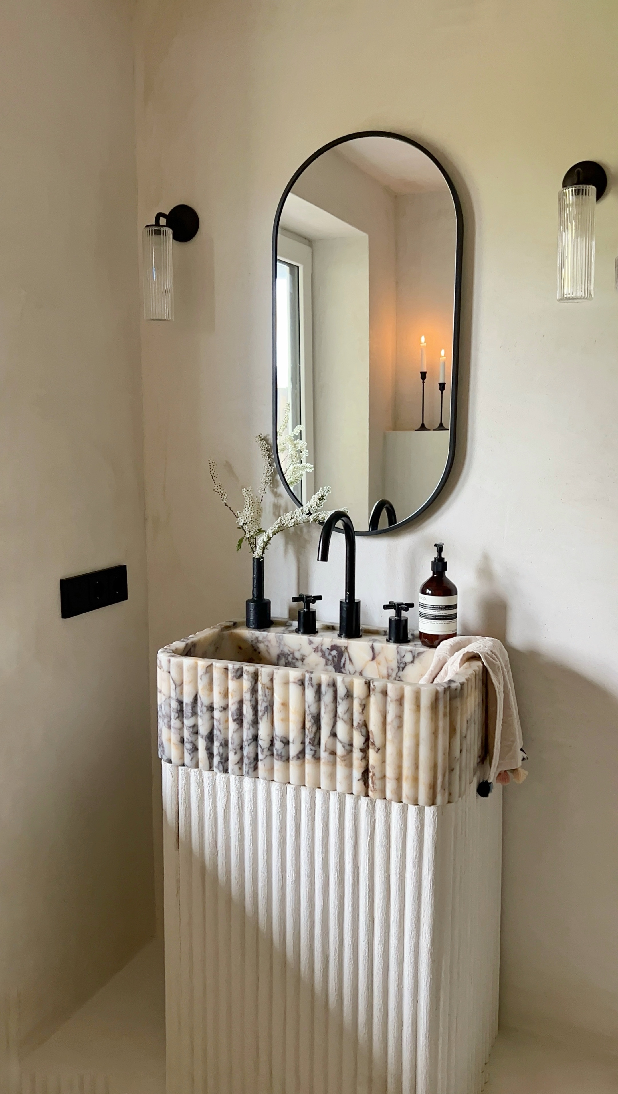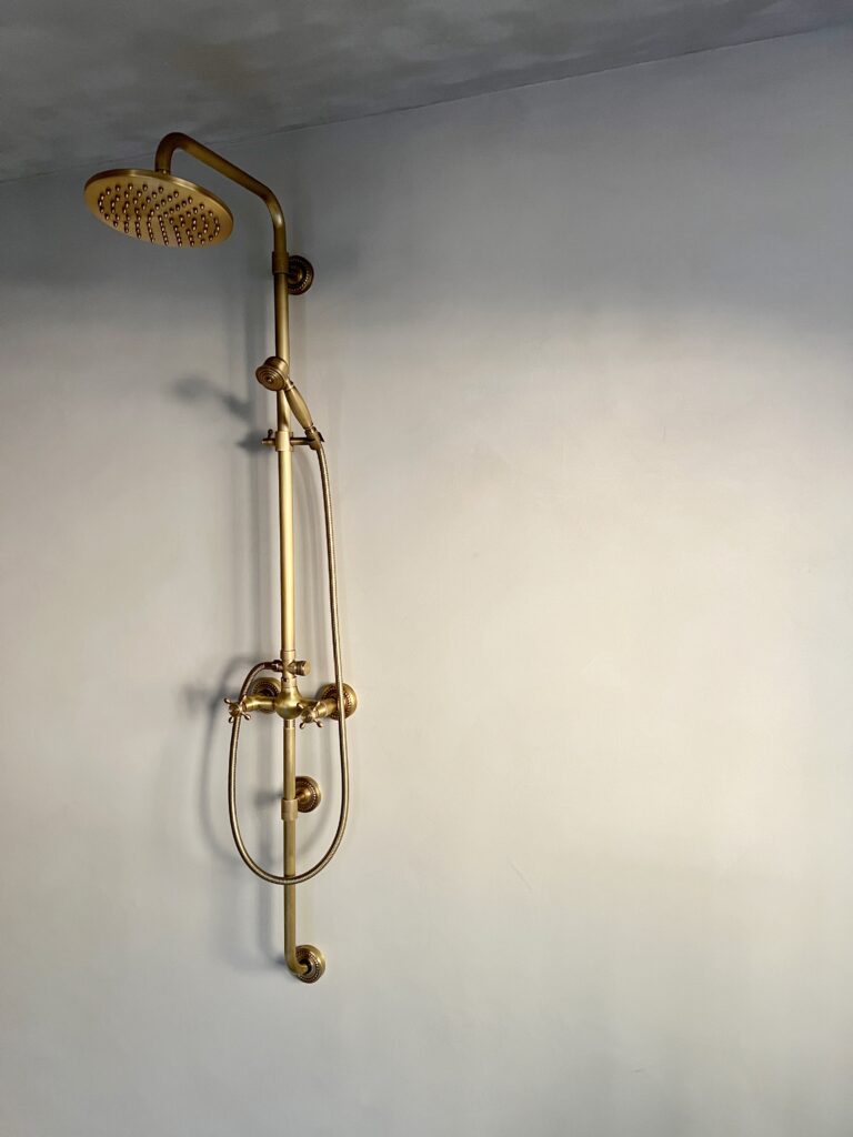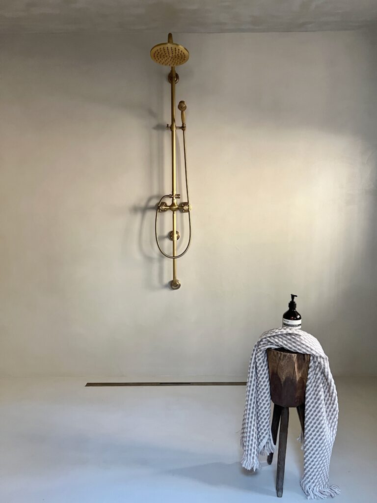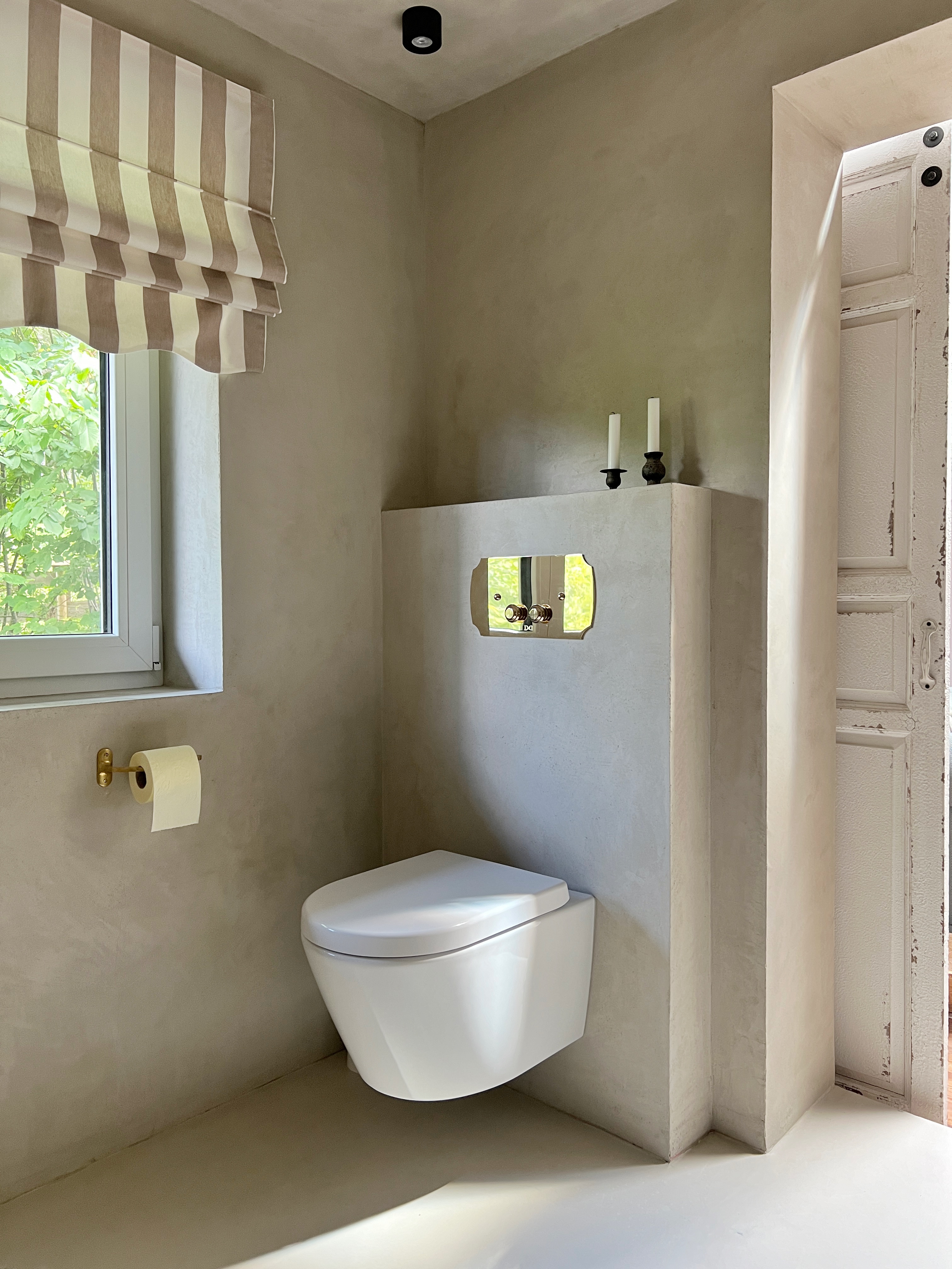 Both bathrooms were kept in mineral plaster and beton cir (micro cement) too. The mix of both of these products ensures that they keep hygienic all while being waterproof. Why I love micro cement bathrooms? Because you don’t have any disgusting or visible joints. The material feels like cashmere on your skin, is easy to clean and maintain, as well as it makes a room look soooo much bigger (ideal for the tiny bathrooms we have). But again, make sure to read the following blogpost on the bathrooms if you want to learn more here.