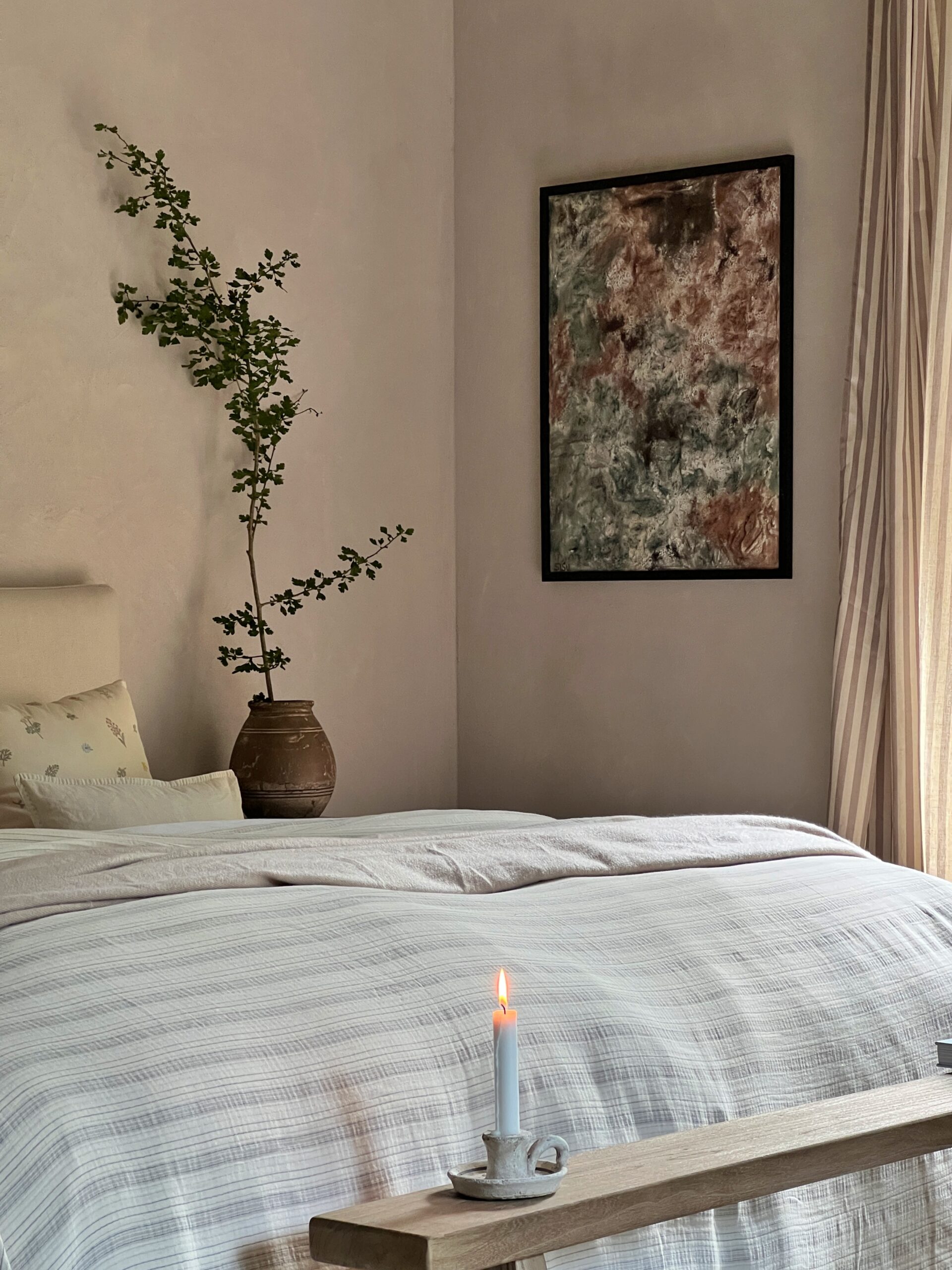 Textured walls from the mineral plaster added warmth and depth to the high walls, as well as lots of personalized products such as the paintings from Kader Boly, and SISU Art. brought in a feeling of warmth. As the bathroom to guest room 1 is an en-suite bathroom, I wanted to add a special door. How boring would a normal door look like? My biggest worry was that the whole wall would have been destroyed by a boring, normal door. The sliding vintage barn doors were a no brainer here! I was in complete awe when I first saw them and still absolutely love them in this space.