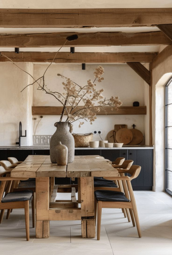 - Emphasizes natural wood tones, distressed finishes, and sturdy construction.
